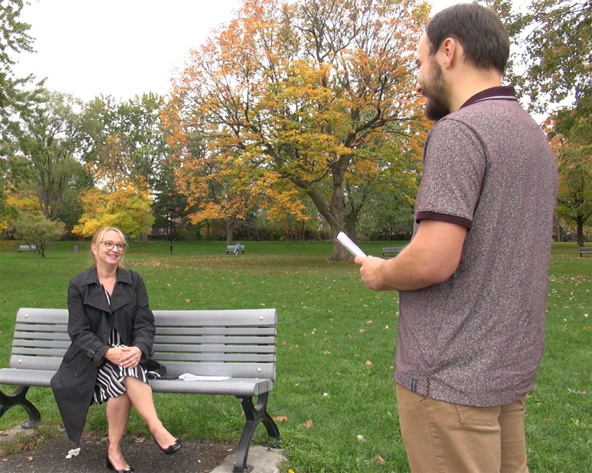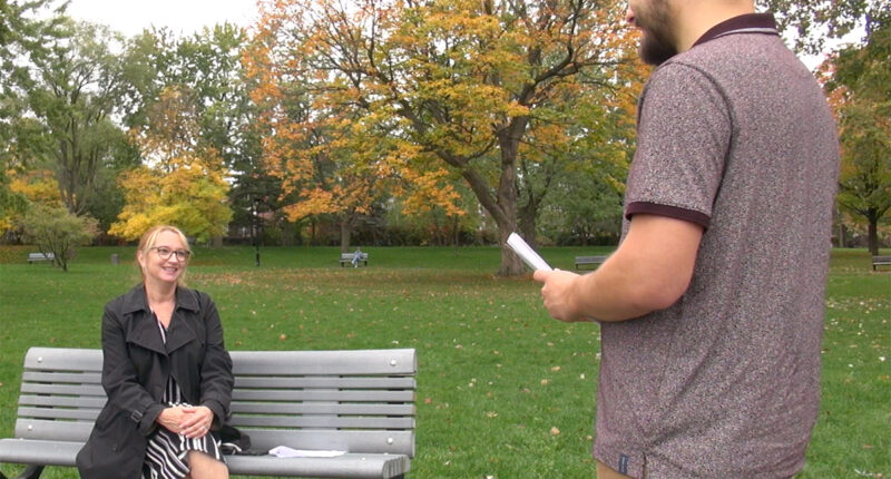 La candidate d’Ensemble Montréal en entrevue avec notre journaliste ÉLoi Fournier. (Photo : Simon Van Vliet, JDV)