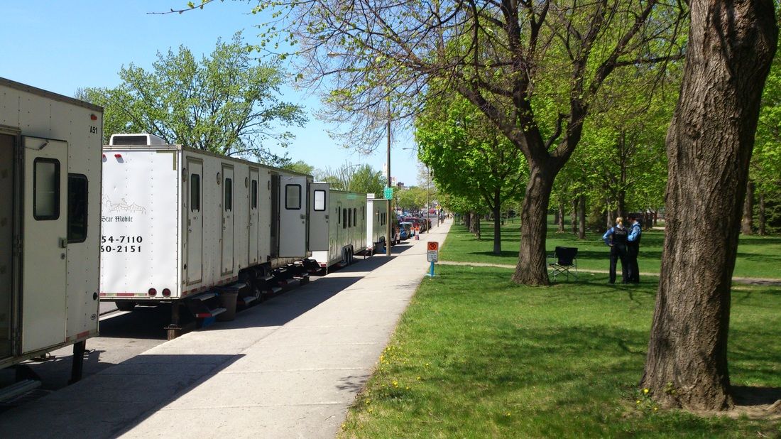 Plusieurs caravanes de l’équipe de tournage s’étaient garées aux abords du parc Ahuntsic ce jour-là.