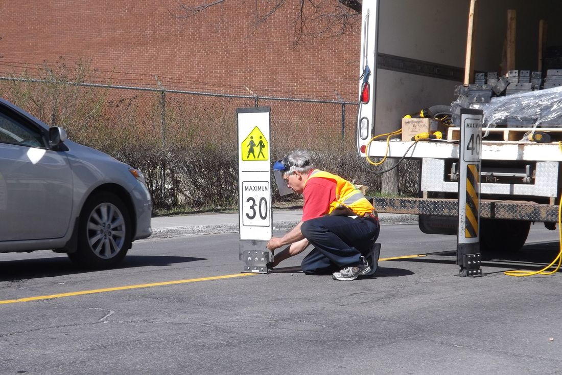 Les balises de rétrécissement, ces sortes de poteaux jaunes servant à ralentir la circulation dans les rues résidentielles, sont installés au printemps dans des trous conçus à cet effet de part et d’autre de la rue et retirés avant l’hiver pour ne pas nuire au déneigement.  À titre d’exemple, il y a des balises de rétrécissement sur l’avenue de l’Esplanade, entre les rues Fleury et Prieur.