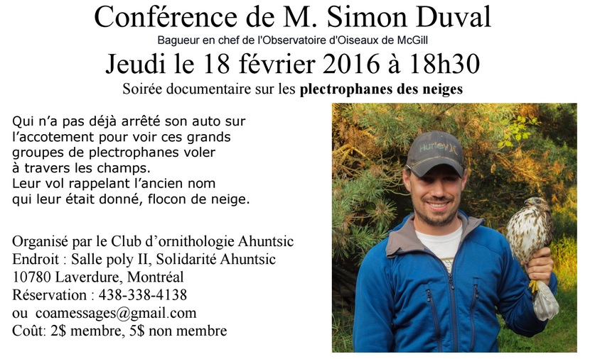 Sortie ornitho-auto à Saint-Hubert et Varennes (radios bidirectionnelles) avec le club d’ornithologie Ahuntsic. Nous serons à la recherche des rapaces d’hiver. Cette région est riche de buses, d’Alouettes hausse-col, Plectrophanes des neiges et lapons. L’hiver dernier, nous y avons observé des Harfangs des neiges et trois Pies grièche. Dîner au restaurant. Covoiturage : 10 $. Information : info@coamontreal.org ou 438-338-4138 (Source : COA)