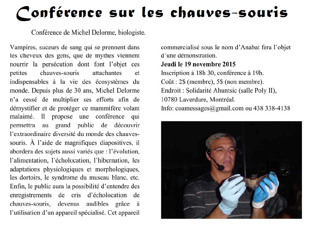 Conférence sur les chauves-souris. Que de mythes ternissent la réputation des chauves-souris : vampires, suceurs de sang qui se prennent dans les cheveux des gens… que de mythes viennent nourrir la persécution dont ils font l’objet! Pourtant, cette petite bête est indispensable à la vie des écosystèmes du monde! Depuis plus de 30 ans, Michel Delorme (biologiste, chercheur et gestionnaire qui a œuvré dans le domaine des jardins zoologiques pendant 31 ans) n’a cessé de multiplier ses efforts afin de démystifier et de protéger ce mammifère volant mal aimé. Il propose une conférence qui permettra au grand public de découvrir l’extraordinaire diversité du monde des chauves-souris. La conférence, présentée par le club d’ornithologie d’Ahuntsic, aura lieu au Centre de solidarité communautaire d’Ahuntsic , 10780 Rue Laverdure, Montréal. 2$ pour les membres et 5$ pour les non membres. Pour plus d’information : 438-338-4138 ou Courriel : coamessages@gmail.com (Source : COA)