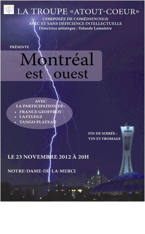 Les 12 comédiens, dont une partie souffrent de déficience légère, présenteront la pièce « Montréal Est-Ouest » (Entre gang de rue, handicap et solidarité) écrite par Mme Lemaistre, également metteure en scène. La pièce relate la vie d’un jeune qui veut sortir de la délinquance. Quelques artistes professionnels apportent également leur concours à la distribution. Ce sont, entre autres, Stéphane Nadon, Lazylegz, ainsi que Tango Plateau, groupe de Michel Daigneault.