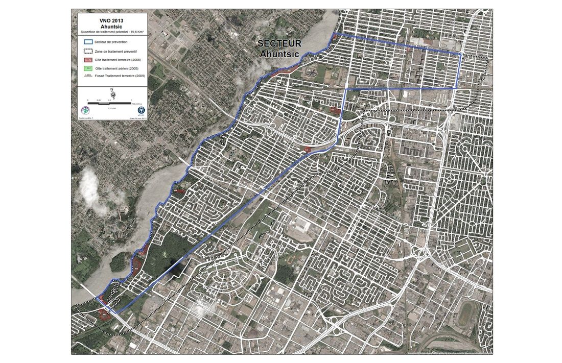 L’arrondissement d’Ahuntsic-Cartierville fait partie des territoires ciblés par l’Institut national de santé publique du Québec (INSPQ), de même que six (6) autres arrondissements, ainsi que le Jardin botanique. C’est la Société de protection des forêts contre les insectes et maladies (SOPFIM) qui a eu le mandat de procéder à cet épandage.