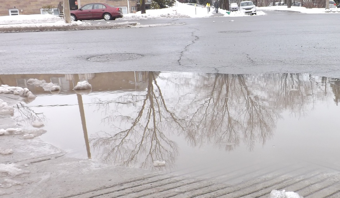 À cause de la chaîne de trottoir qui a été abaissée pour que les piétons, les poussettes et les chaises roulantes aient accès plus facilement aux coins des rues (et c’est le cas un peu partout dans le quartier), cela entraîne quelques inconvénients en cas de pluies abondantes ou de neige fondante, comme ce fut le cas mercredi et jeudi en fin de journée et en soirée.