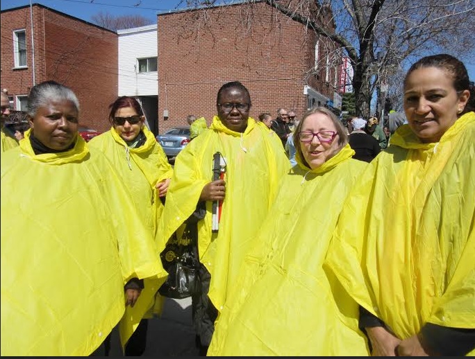 Crédit-photo : Groupe La Jarnigoine de Villeray. On aperçoit au centre, Claude Ampleman, directrice du CRÉCA dans Ahuntsic, entourée de quatre apprenantes en alpha-pop du Créca présentes lors de la manifestation. De g. à dr. : Adonne, Ana-Délia, Marie-Anna, Claude Ampleman et Rabia.