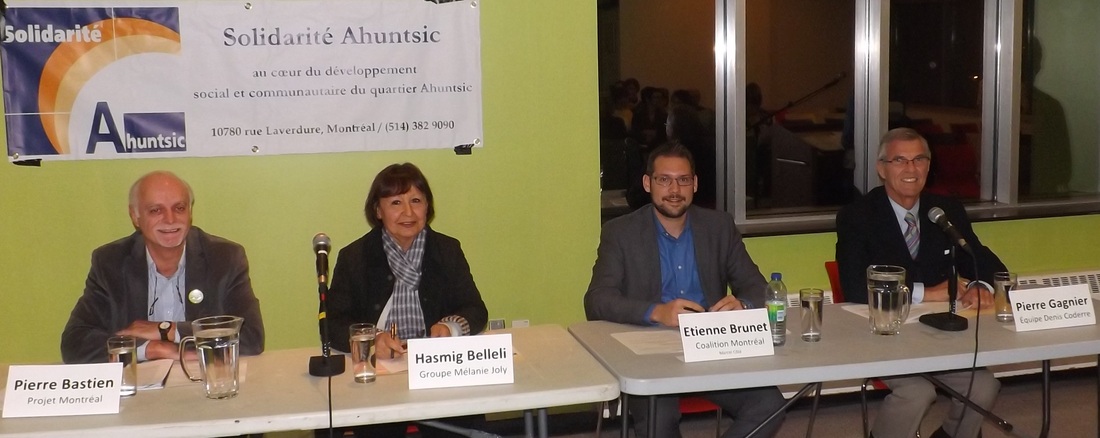 Devant environ 200 personnes, les quatre candidats à la mairie ont répondu aux questions de Solidarité Ahuntsic (les questions leur avaient été expédiées à l’avance) et aux questions des citoyens. Étaient au rendez-vous: Pierre Bastien (Projet Montréal); Hasmig Belleli (Groupe Mélanie Joly); Étienne Brunet (Coalition Montréal); Pierre Gagnier (Équipe Coderre).