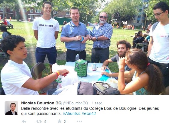 Samuel, l’un de ses anciens étudiants, l’aide justement par l’entremise des réseaux sociaux à joindre d’autres jeunes afin qu’ils militent et votent pour le Bloc. « C’est important pour le mouvement souverainiste d’avoir le vote des jeunes» a-t-il mentionné. Pendant longtemps, ce vote des jeunes était acquis au Bloc (et au PQ), mais ce n’est plus le cas aujourd’hui. Il y a donc beaucoup de travail à faire de ce côté.