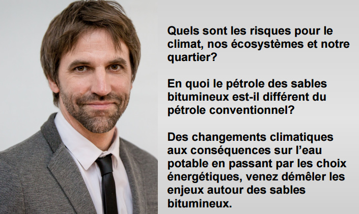 Conférence sur l’arrivée des sables bitumineux au Québec par Steven Guilbeault, au Café de DA, 545 Fleury Est. Inscription à partir du 2 septembre au comptoir du prêt ou par téléphone 514 872-0568 (Source : Arrondissement)