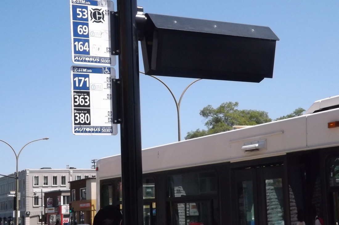 Certains arrêts de bus de la STM sont équipés d’une borne d’information qui devrait être activée à l’automne. En voici une sur la rue Saint-Denis, au nord d’Henri-Bourassa (Photo : Philippe Rachiele)
