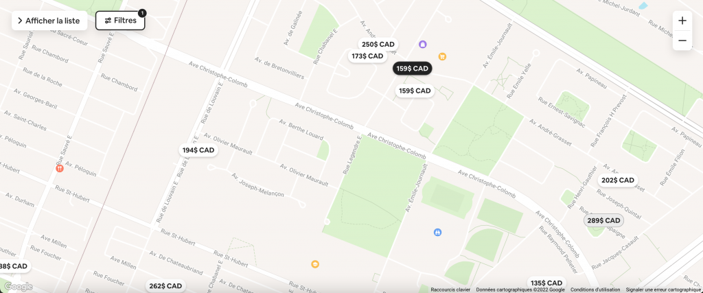 En pratique, ce règlement est très peu respecté. En observant la liste des logements disponibles dans l’arrondissement sur le site Web de la plateforme, il est facile de noter que plusieurs d’entre eux sont situés à des endroits où, en théorie, ils sont proscrits. Par exemple, cette capture d’écran montre que de nombreuses habitations sont disponibles dans le Domaine Saint-Sulpice, même dans des zones interdites par le règlement municipal.