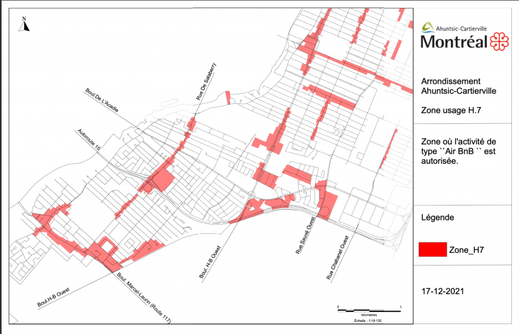 Il y a quelques années, l’arrondissement s’est même doté d’un règlement de zonage régissant les locations de courte durée. Selon ce règlement, il est seulement possible d’en avoir dans les édifices de 36 logements et plus, délimité dans les zones rouges de la carte ci-dessous.