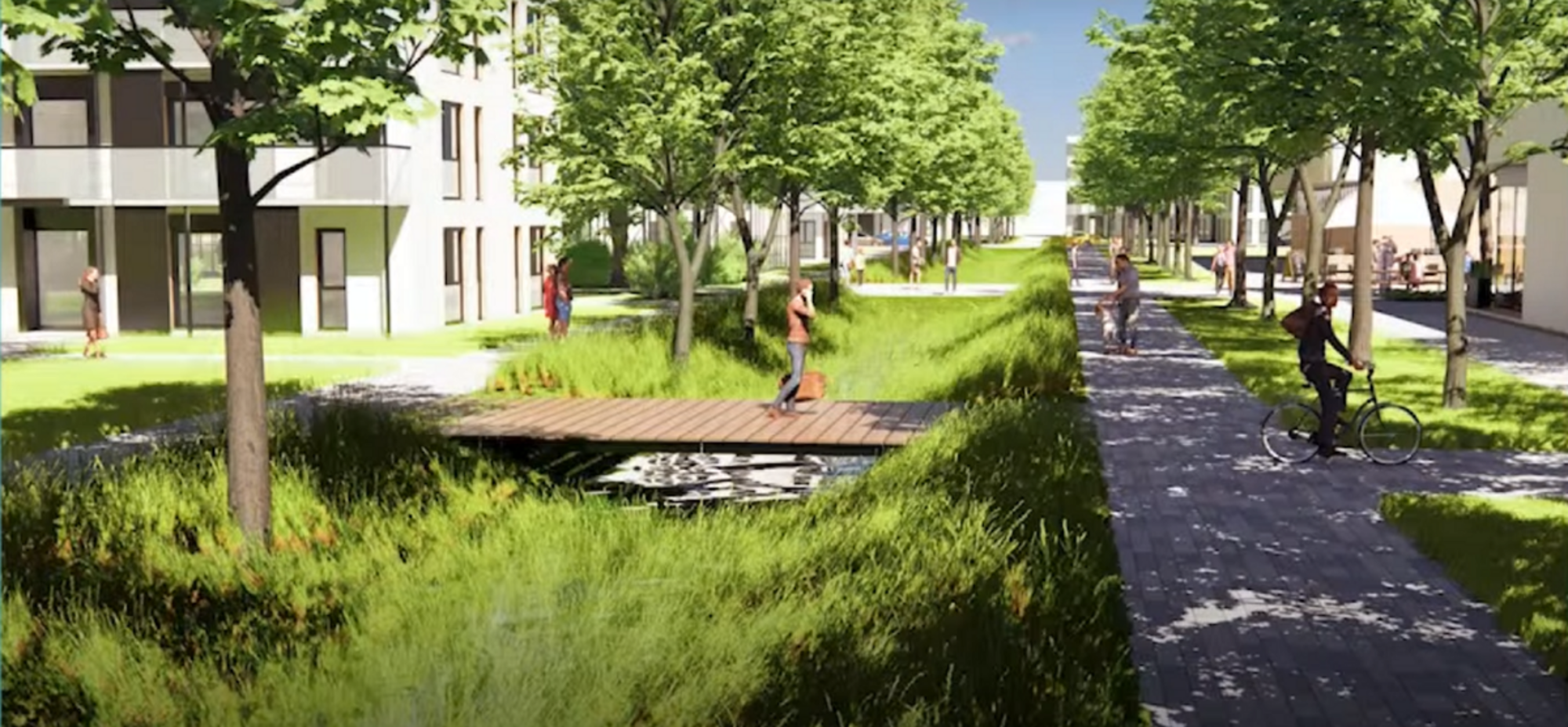 La noue (fossé) végétalisée fait en sorte que l’eau et la végétation pourraient ruisseler d’un bout à l’autre du site rappelant l’effet d’une rivière. Elle permet notamment de maximiser la rétention de l’eau. Les citoyens pourraient en apprécier la fraîcheur et s’y tremper les pieds.