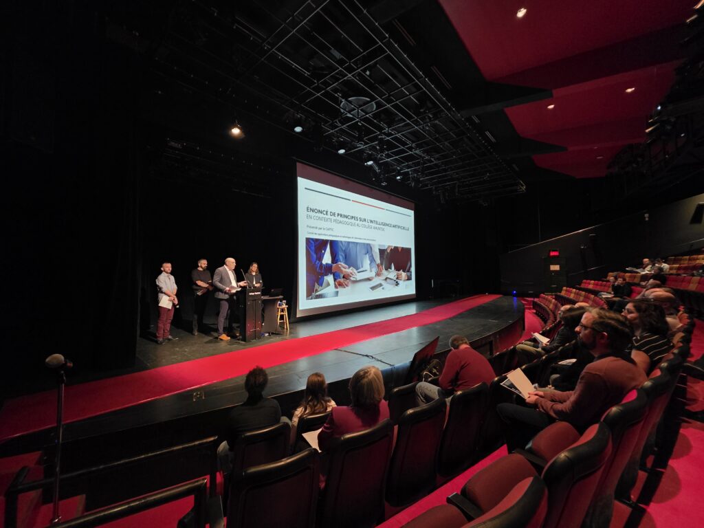 «C’est vraiment un énoncé de principes en IA qui touche l’enseignement, la classe et cette relation pédagogique», a souligné Charles Dufy, directeur des études au Cégep Ahuntsic, en présentant le document à l’assistance dans la salle L’Espace le vrai monde?.
