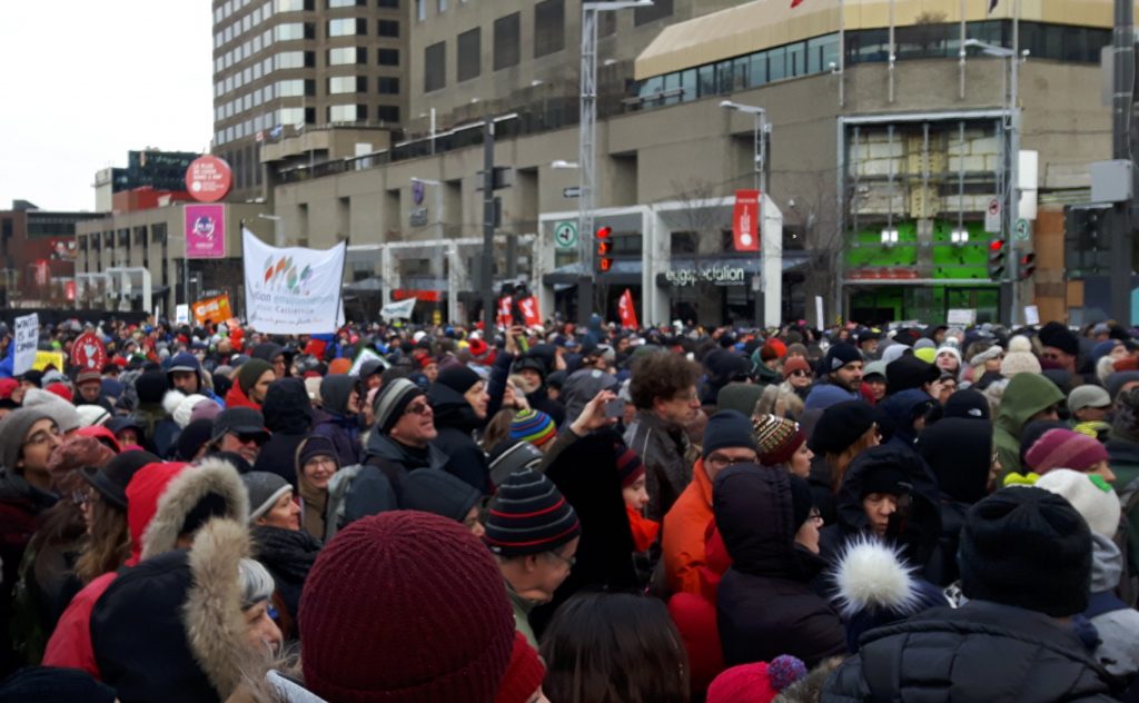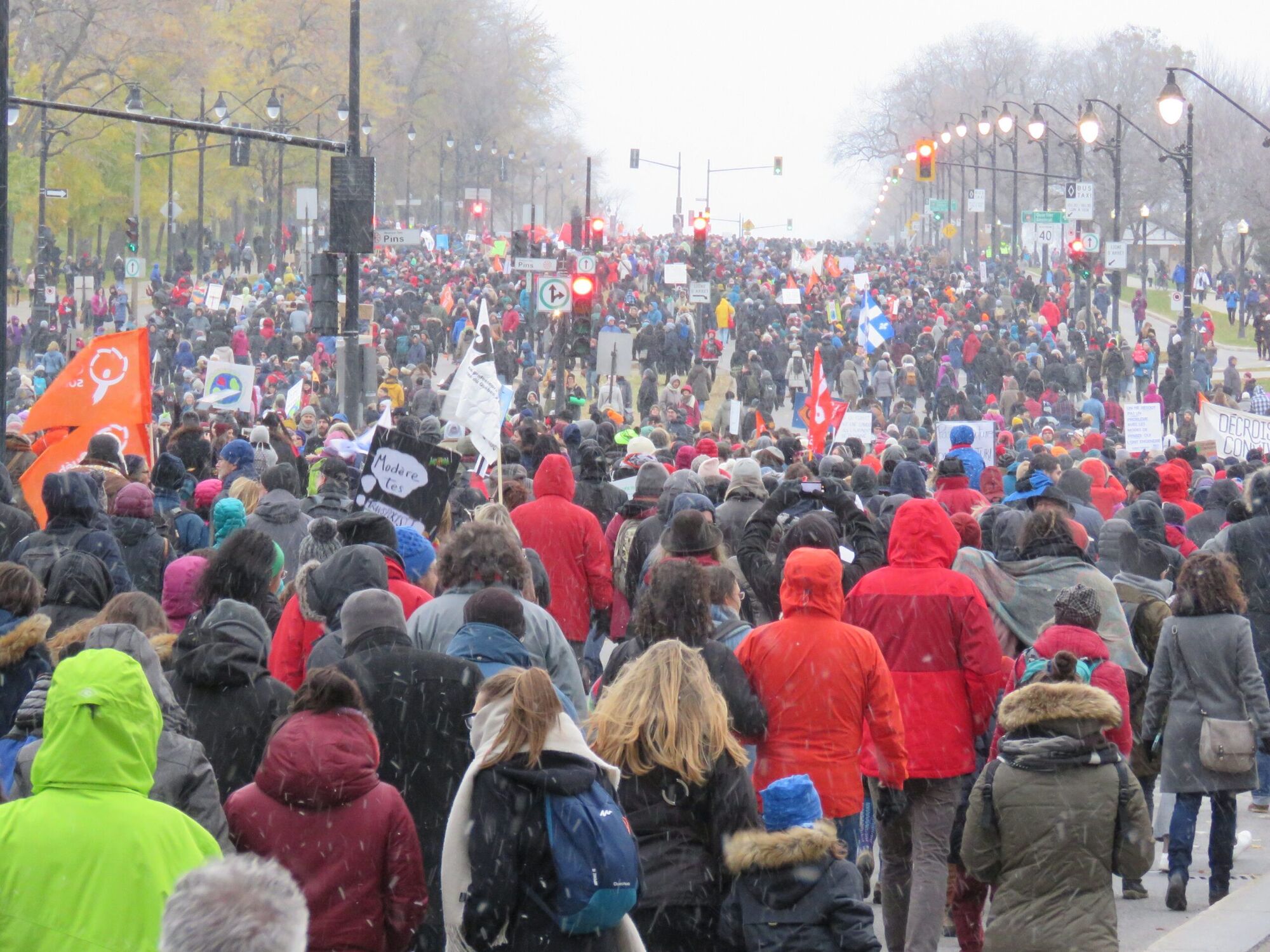 Samedi, 10 novembre, une Grande marche organisée par le collectif citoyen «La planète s’invite au parlement», qui milite pour les questions environnementales, avait été organisée dans plusieurs villes du Québec, notamment à Montréal, où elle aurait réuni environ 50 000 personnes qui sont parties de la Place des Festivals, selon les organisateurs. Le jdv était présent. À un certain moment, la foule scandait : «À qui la planète», et se répondait: «À nous la planète!»