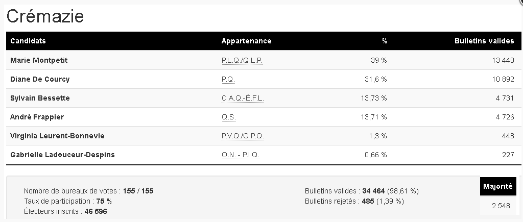 Dans la circonscription de Crémazie, les électeurs sont représentés à l’Assemblée nationale par Diane De Courcy, députée élue sous la bannière du Parti Québécois; et ministre de l’Immigration et des Communautés culturelles, et ministre responsable de la Charte de la langue française dans le cabinet dissous en vue des élections.