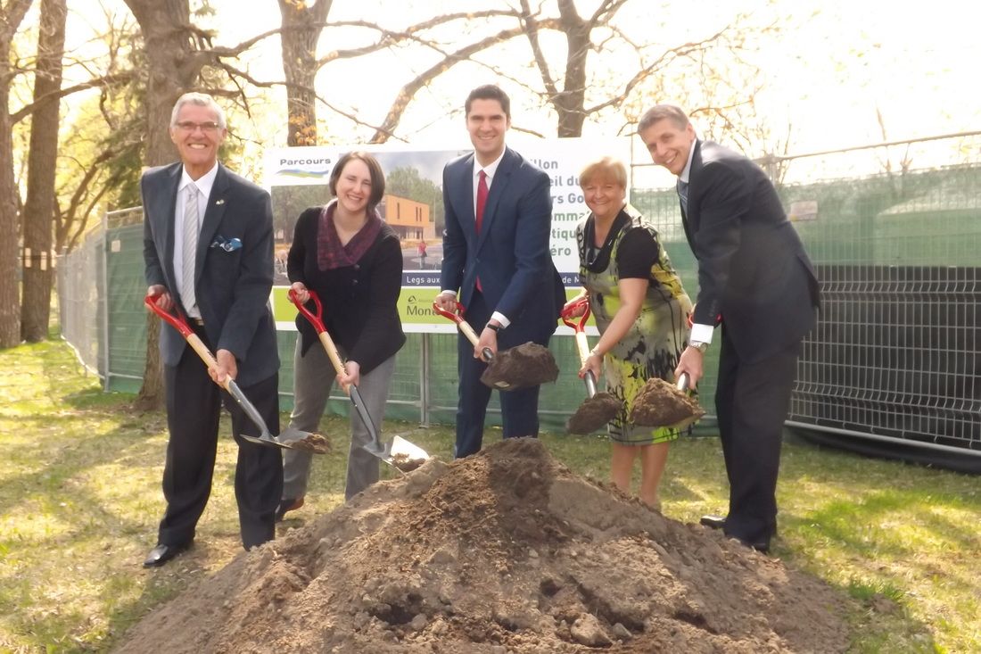 La première pelletée de terre a eu lieu le 12 mai en présence des élus de l’arrondissement, de quelques employés et invités. Le pavillon sera le premier édifice à consommation énergétique nette zéro de Montréal. Il sera alimenté par des panneaux solaires et construit de manière à réduire au minimum ses besoins énergétiques en surpassant les exigences du Code du bâtiment.