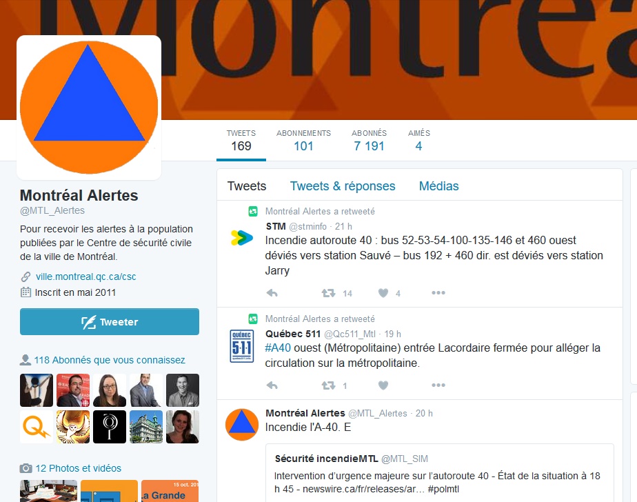 Par le plus grand des hasards, les bureaux du siège social de la Sécurité civile de Montréal sont situés à proximité du lieu d’impact de l’accident, angle Saint-Hubert et Crémazie. Cependant, la première alerte lancée sur Twitter par « Montréal Alerte », du Centre de sécurité civile, a seulement été publiée à 20 h, soit quatre heures après le début les événements.
