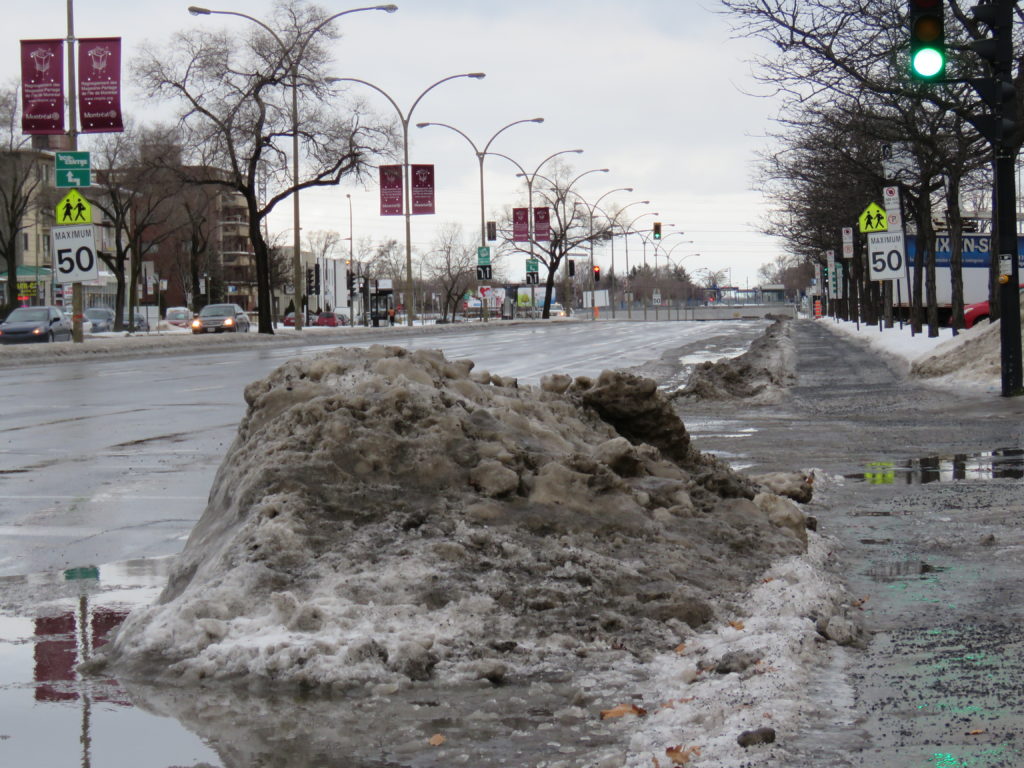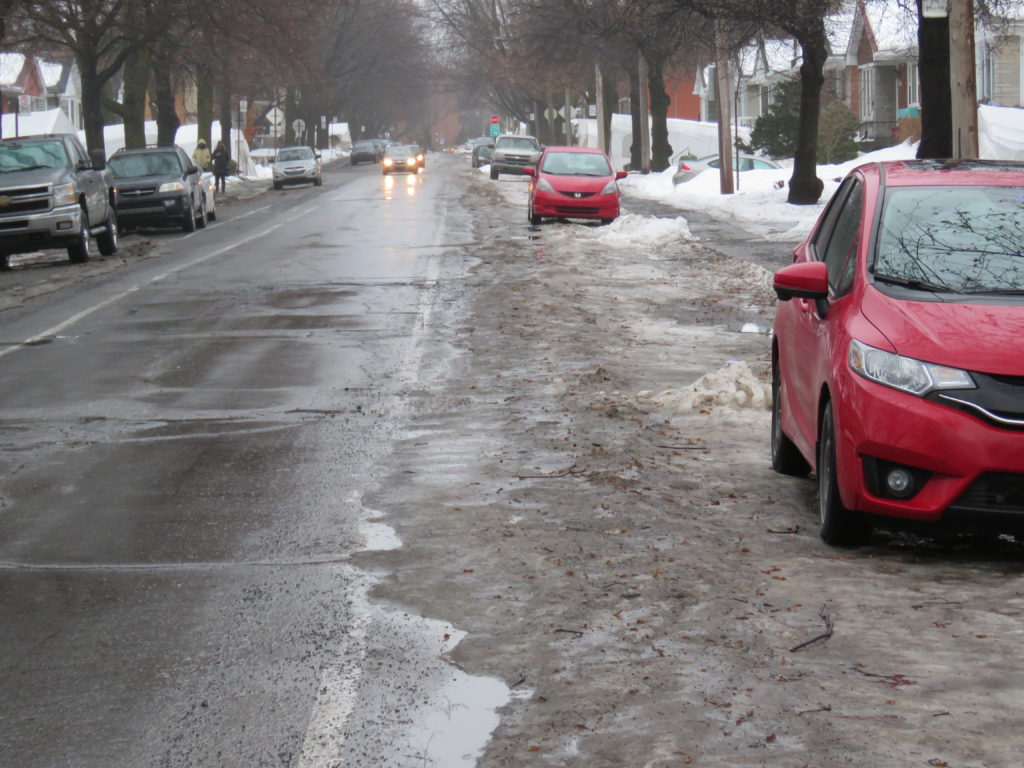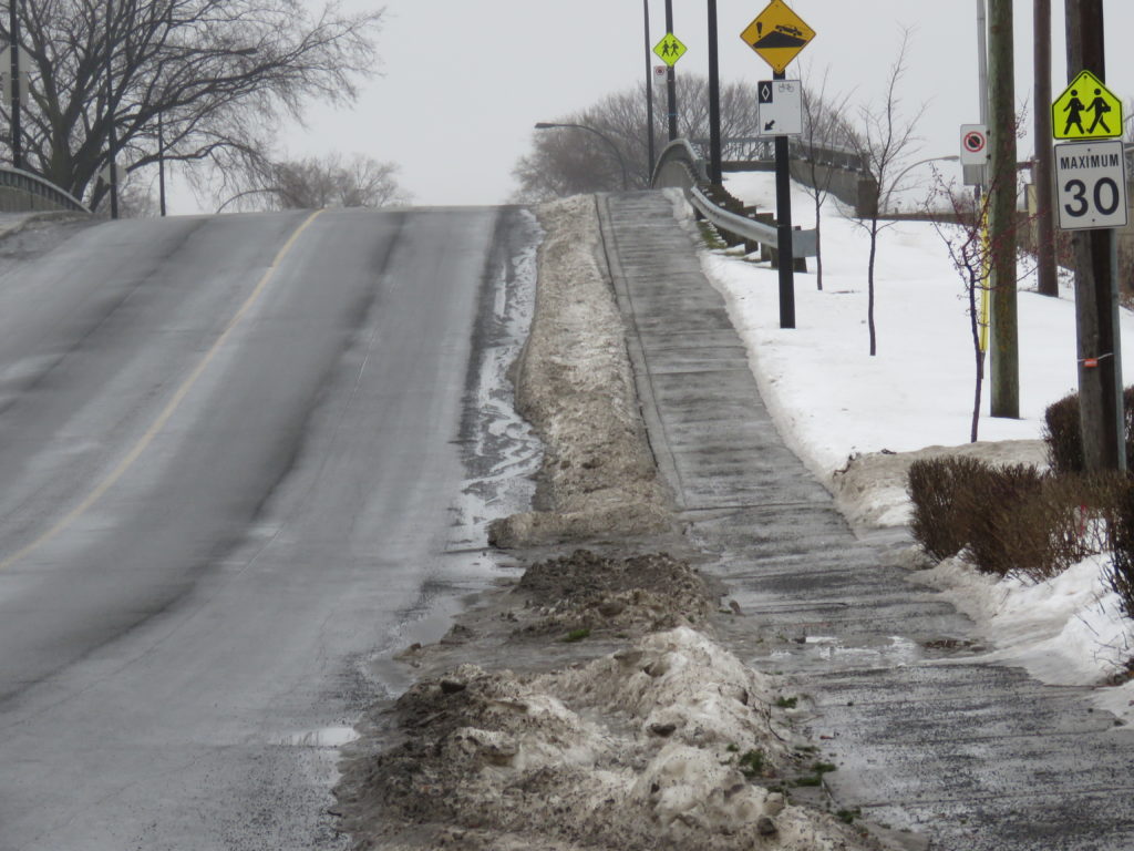 C’est un amas de neige comme celui-ci qu’aurait heurté l’automobiliste décédé. L’amas de neige, comme celui que l’on voit à l’avant de la photo, était dans la piste cyclable, quelques mètres plus à l’ouest, au moment de la collision. Au passage du photographe, le 27 décembre, l’amas de neige dangereux avait été enlevé mais celui sur la photo était toujours présent. (Photo: jdv Philippe Rachiele)