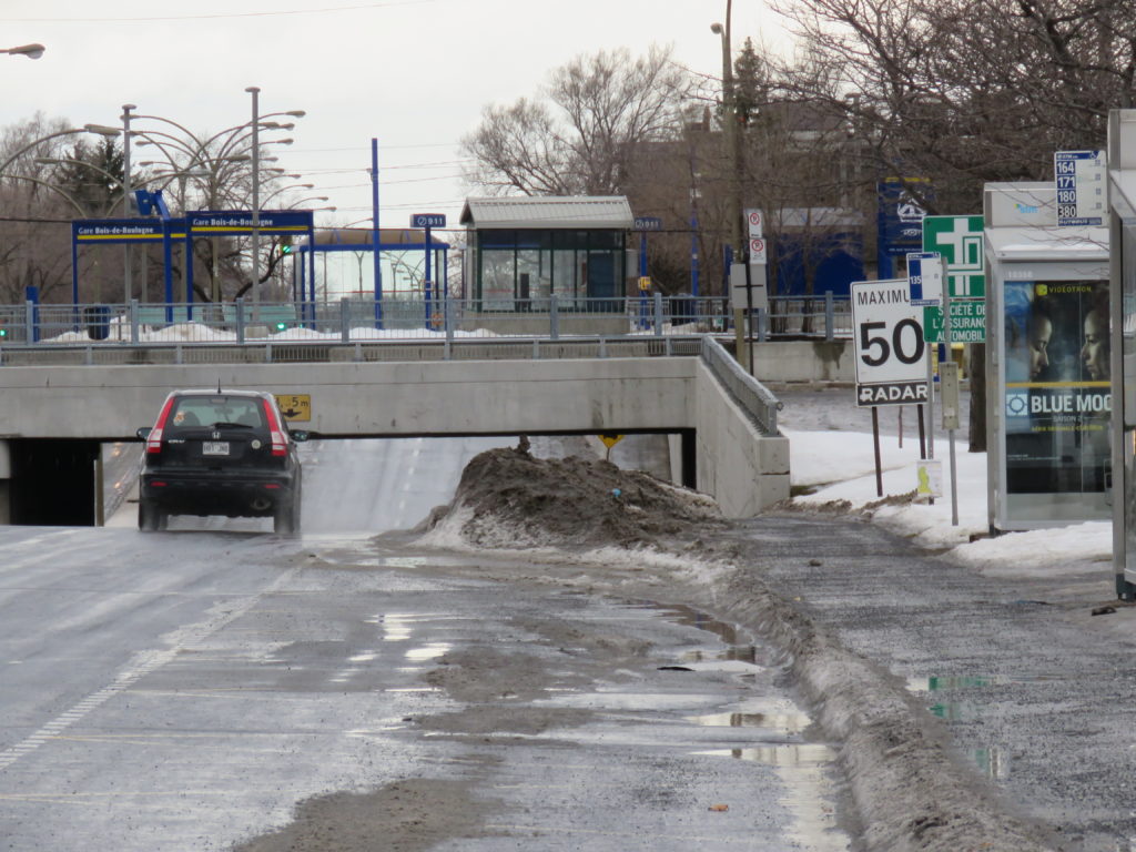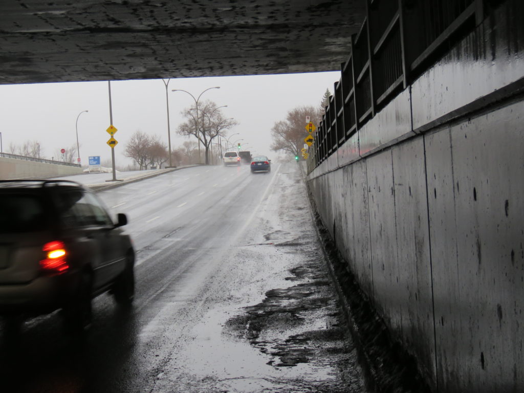 Voie cyclable quatre saisons sous le viaduc Henri-Bourassa (glacée et encombrée de gravier) (Photo: jdv Philippe Rachiele)