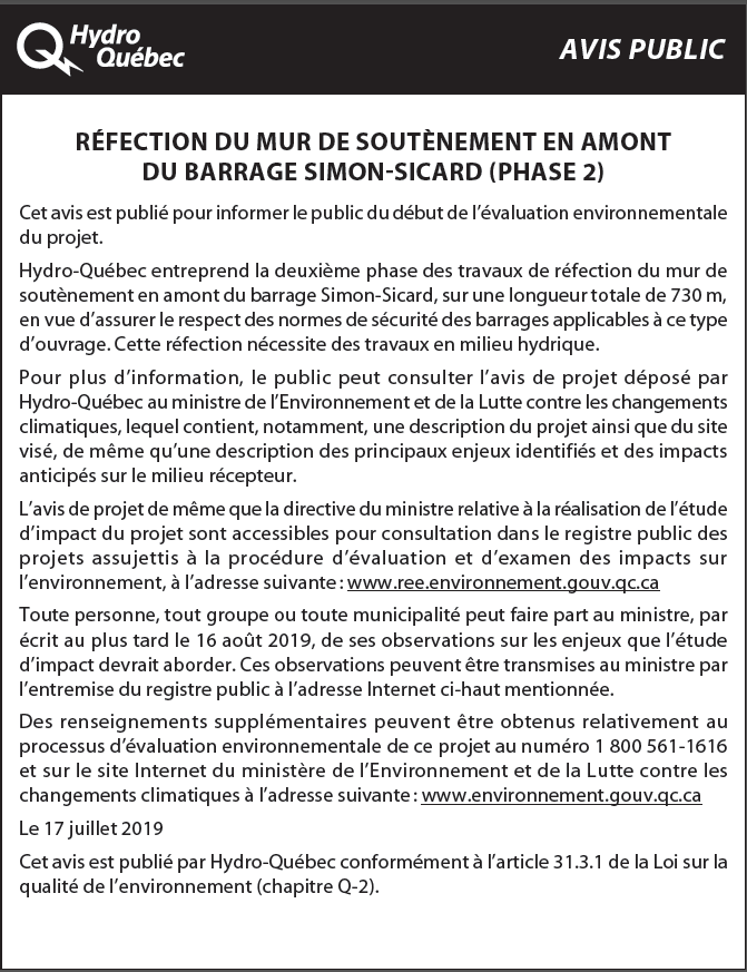 Cet avis est publié par Hydro-Québec conformément à l’article 31.3.1 de la Loi sur la qualité de l’environnement (chapitre Q-2).