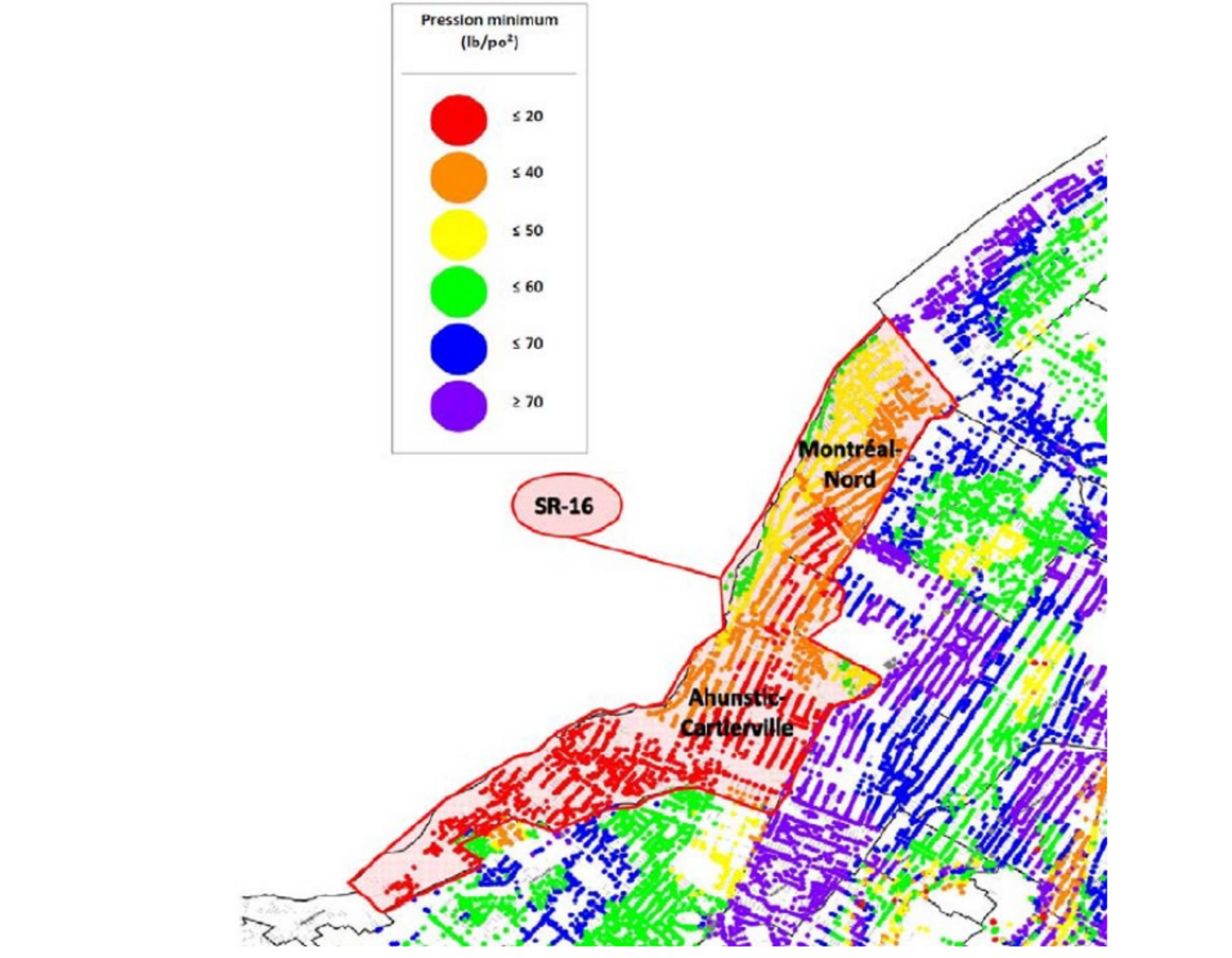 Les documents de la Ville de Montréal indiquent que, lors de la fermeture de la conduite de 900 mm de diamètre sous l’autoroute des Laurentides, la pression du secteur chute sous 20 lb/po².