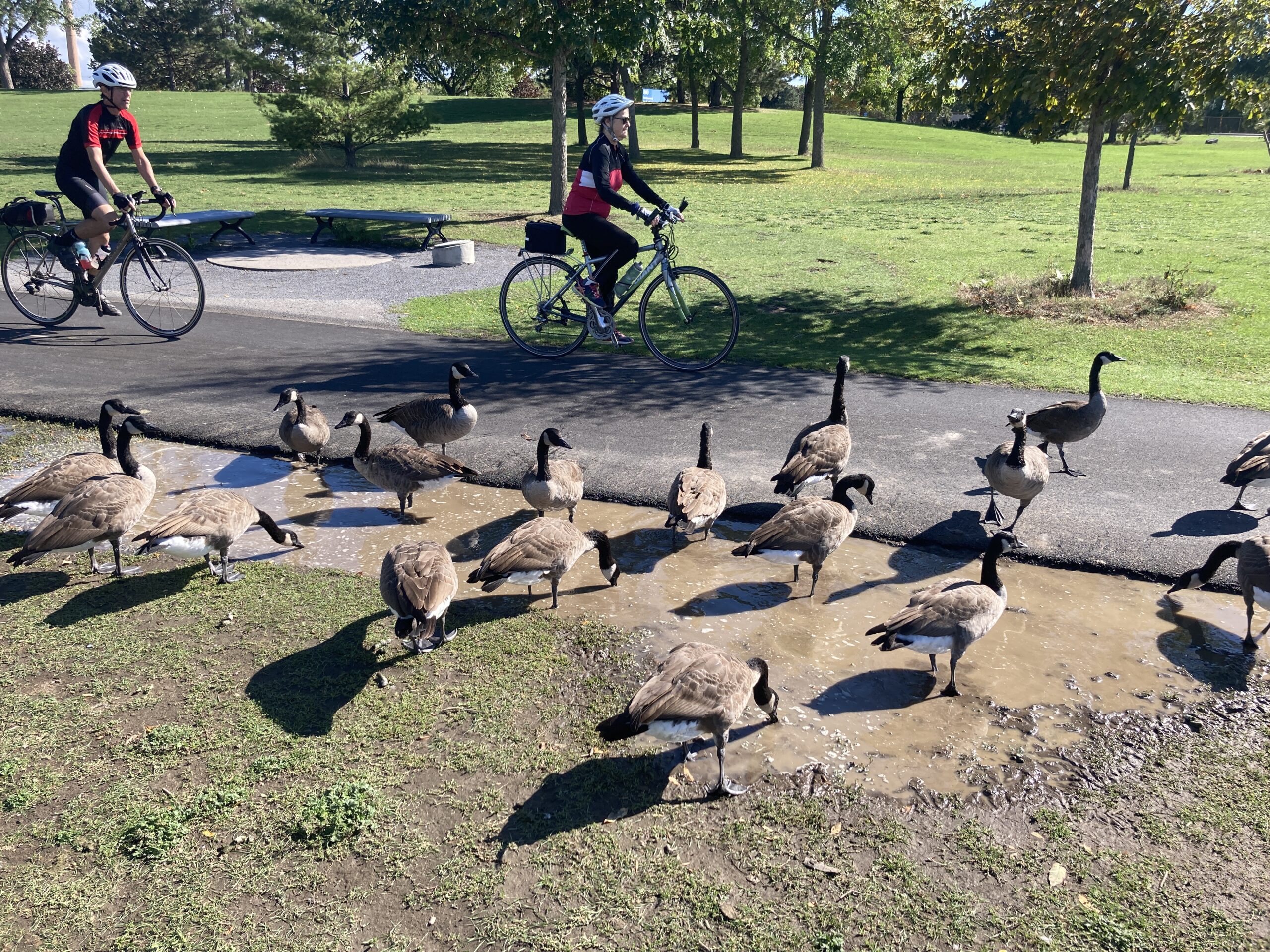 À Ahuntsic, depuis trois ans, la gestion active se fait avec des chiens entraînés à courir après les oiseaux de façon sécuritaire. «Nous voulons seulement effaroucher les bernaches. En aucun cas, les chiens ne touchent les oiseaux. Notre objectif n’est pas de les blesser, mais de recréer la peur d’un prédateur. Le coyote étant leur principal prédateur, nous utilisons les canidés pour vraiment aider à mettre de la pression. Il faut être là plusieurs jours par semaine pour mieux les contrôler. Il ne faut pas oublier qu’il y a deux ou trois ans, nous pouvions dénombrer au parc de la Merci jusqu’à 350 bernaches sur le terrain; cela représentait un vrai problème de sécurité pour les cyclistes. Nous pouvons dire qu’elles sont souvent les reines de la piste cyclable.»