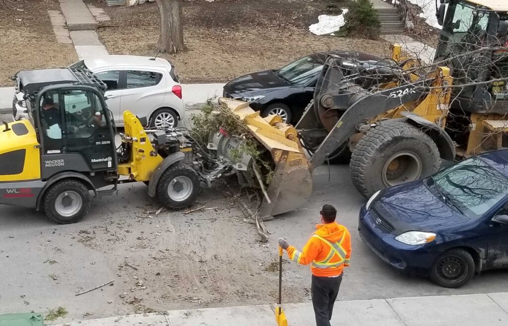 Ramassage des branches brisées lors du verglas d’avril 2023 par les employés de l’arrondissement d’Ahuntsic-Cartierville. (Photo: Philippe Rachiele, JDV)