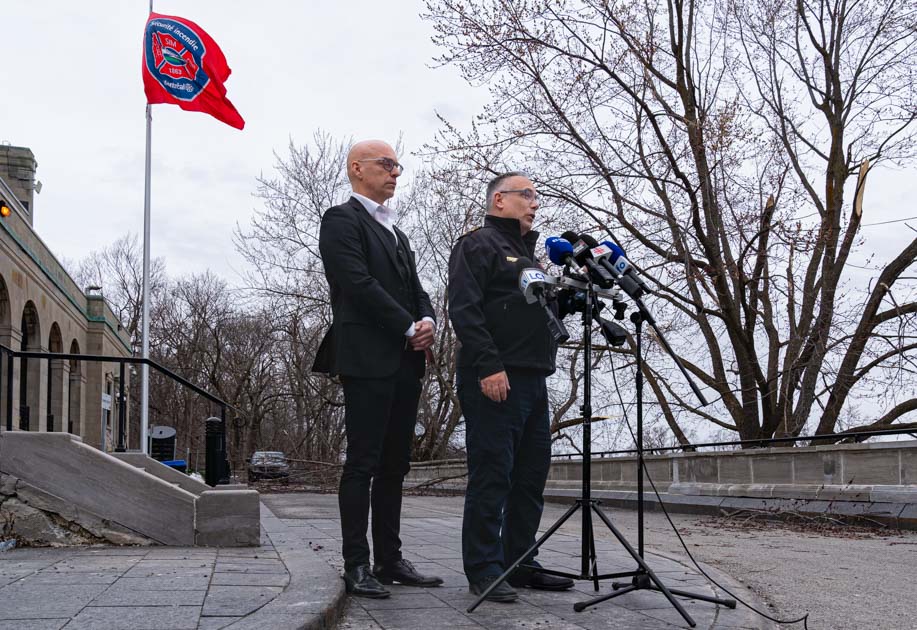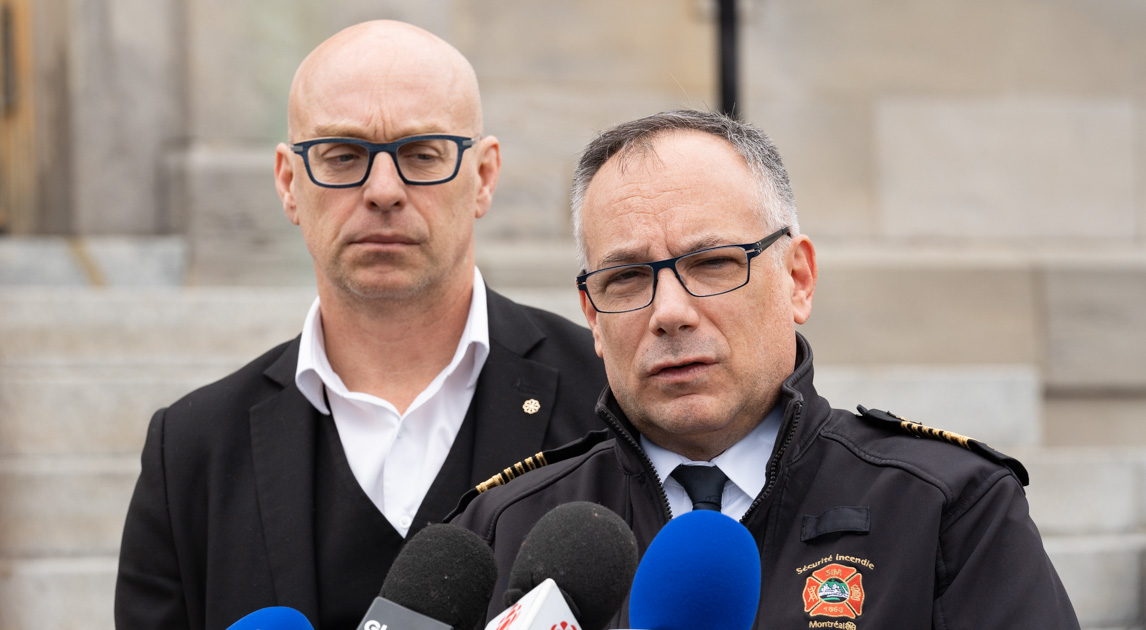 Bilan de la situation après l’épisode de verglas, présenté par la Ville de Montréal le 11 avril 2023. La conférence de presse a eu lieu au quartier général du Service de sécurité incendie de Montréal. De gauche à droite: Alain Vaillancourt, responsable de la sécurité publique au sein du comité exécutif et conseiller du district de Saint-Paul-Émard-Saint-Henri-Ouest, et Richard Liebmann, coordonnateur de la sécurité civile et directeur du Service de sécurité incendie de Montréal. (Photo: François Robert-Durand, JDV)