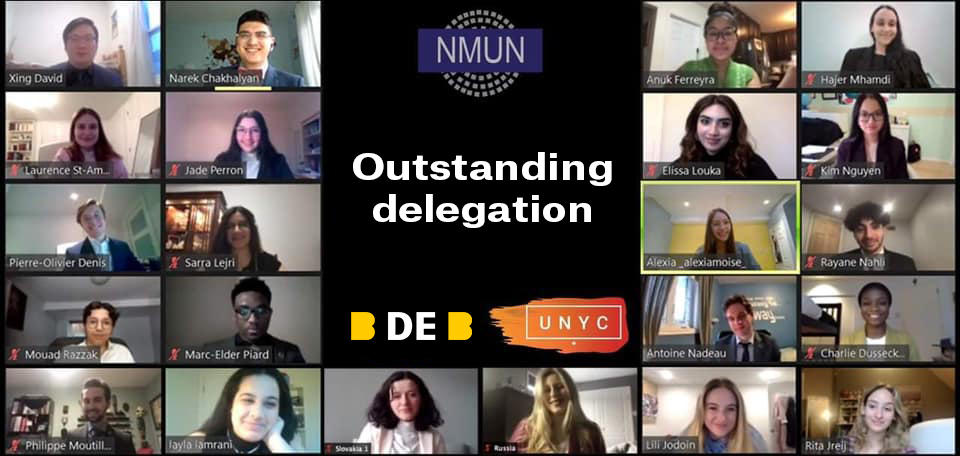 Montréal, le 16 avril 2021 – Du 28 au 31 mars dernier, une équipe de vingt étudiants du Collège de Bois-de-Boulogne s’est distinguée au National Model United Nations 2021, la plus prestigieuse simulation des Nations Unies, à New York. Au total, 127 délégations de partout dans le monde se sont réunies (pour une première édition virtuelle de la conférence) pour collaborer, échanger, fraterniser, réfléchir et débattre sur des sujets tels que les droits humains, l’agriculture, le terrorisme, la cybercriminalité, etc.
