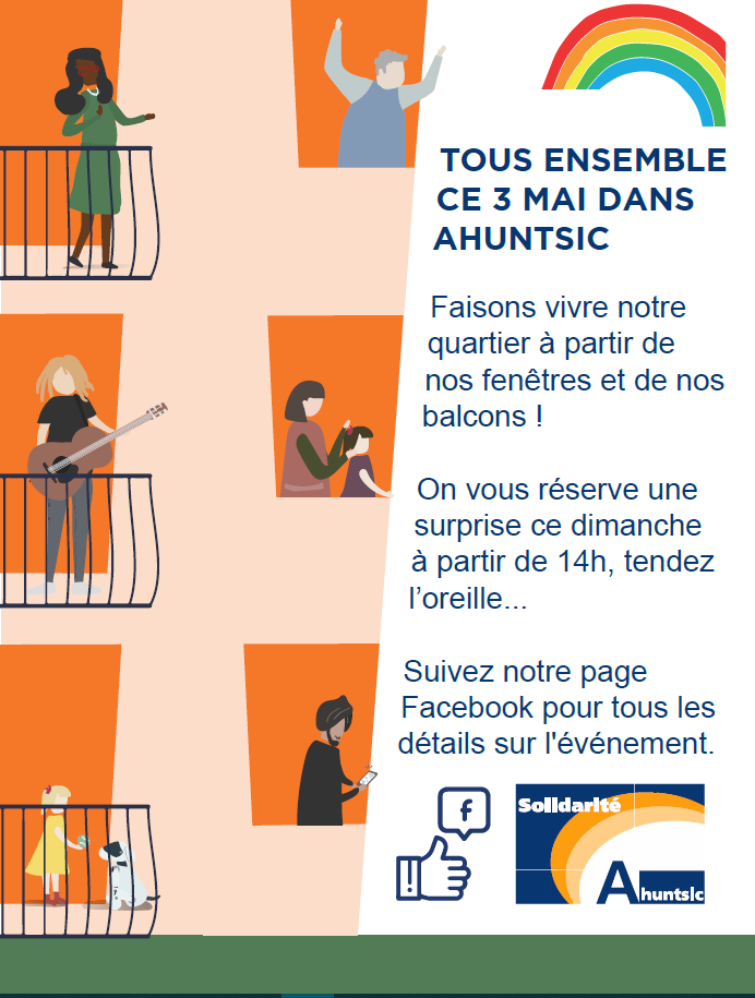 Le 3 mai prochain entre 14h et 17h, la Table de quartier Solidarité Ahuntsic sillonnera les rues du quartier Ahuntsic, en compagnie de Kattam et ses Tam-Tams, pour une activité de mobilisation alliant information, musique et animation de rue. Soucieuse de rejoindre les communautés multiculturelles du secteur Saint-Simon, Solidarité Ahuntsic diffusera un message informatif multilingue. Kattam et ses Tam-Tams a composé un morceau de musique spécialement pour l’occasion. Le trajet ne sera pas diffusé afin d’éviter tout regroupement dans les rues, mais les résident.e.s du quartier pourront participer à l’activité en écoutant, chantant et dansant depuis leur domicile.