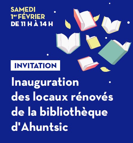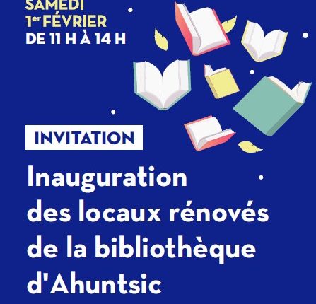 La mairesse de l’arrondissement, Émilie Thuillier et l’équipe de la bibliothèque d’Ahuntsic invitent la population à l’inauguration des locaux fraîchement rénovés de la bibliothèque, située au 10300, rue Lajeunesse, samedi 1er février, de 11 h à 14 h. Lors de l’événement, l’arrondissement procèdera au lancement d’un concours afin de trouver un nom à son nouveau « système de retour automatisé », le plus volumineux du réseau des bibliothèques de la Ville de Montréal.
