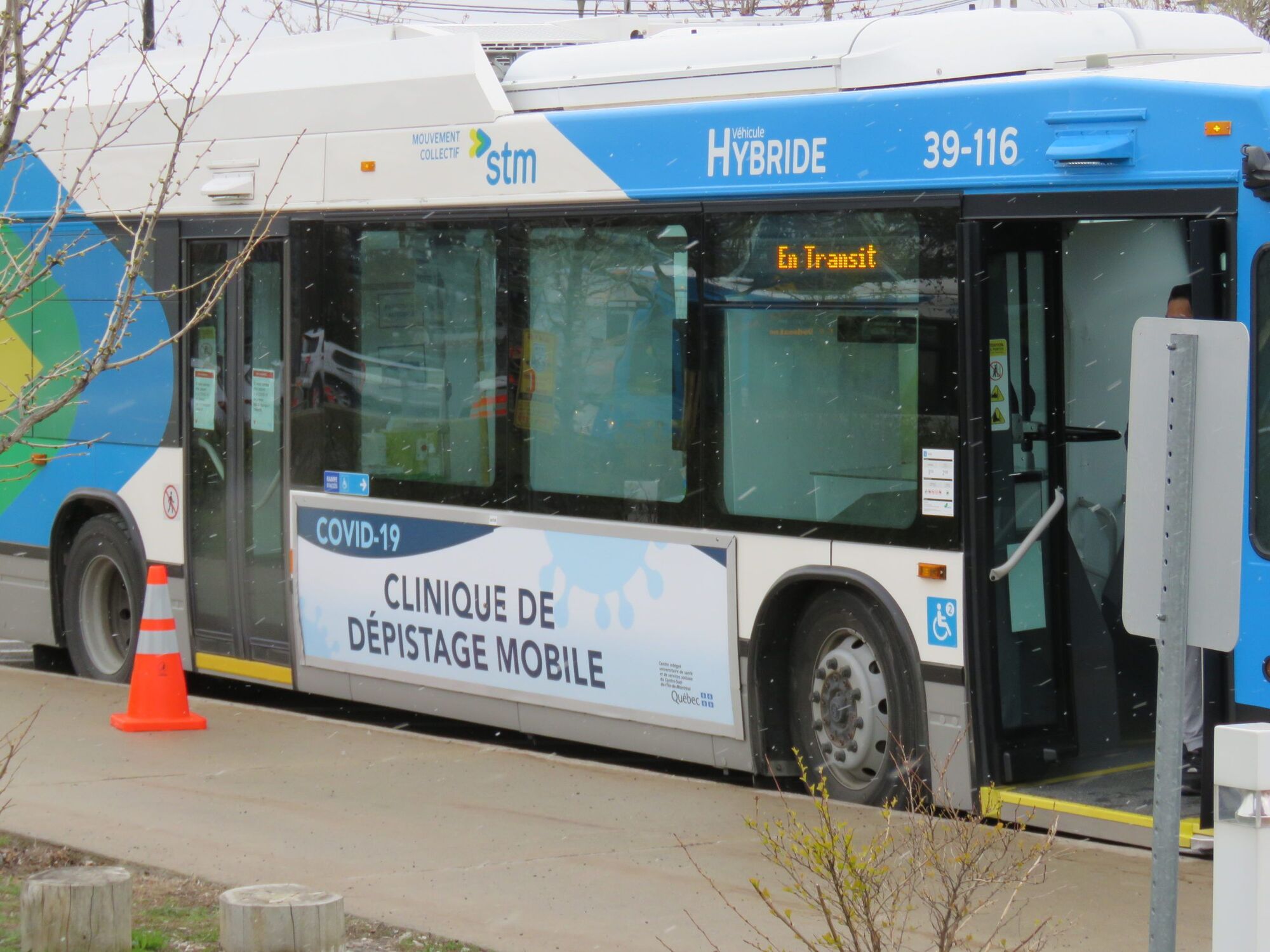 Autobus converti en clinique de dépistage mobile pour la COVID-19 au YMCA de Cartierville (Photo : Philippe Rachiele, JDV)