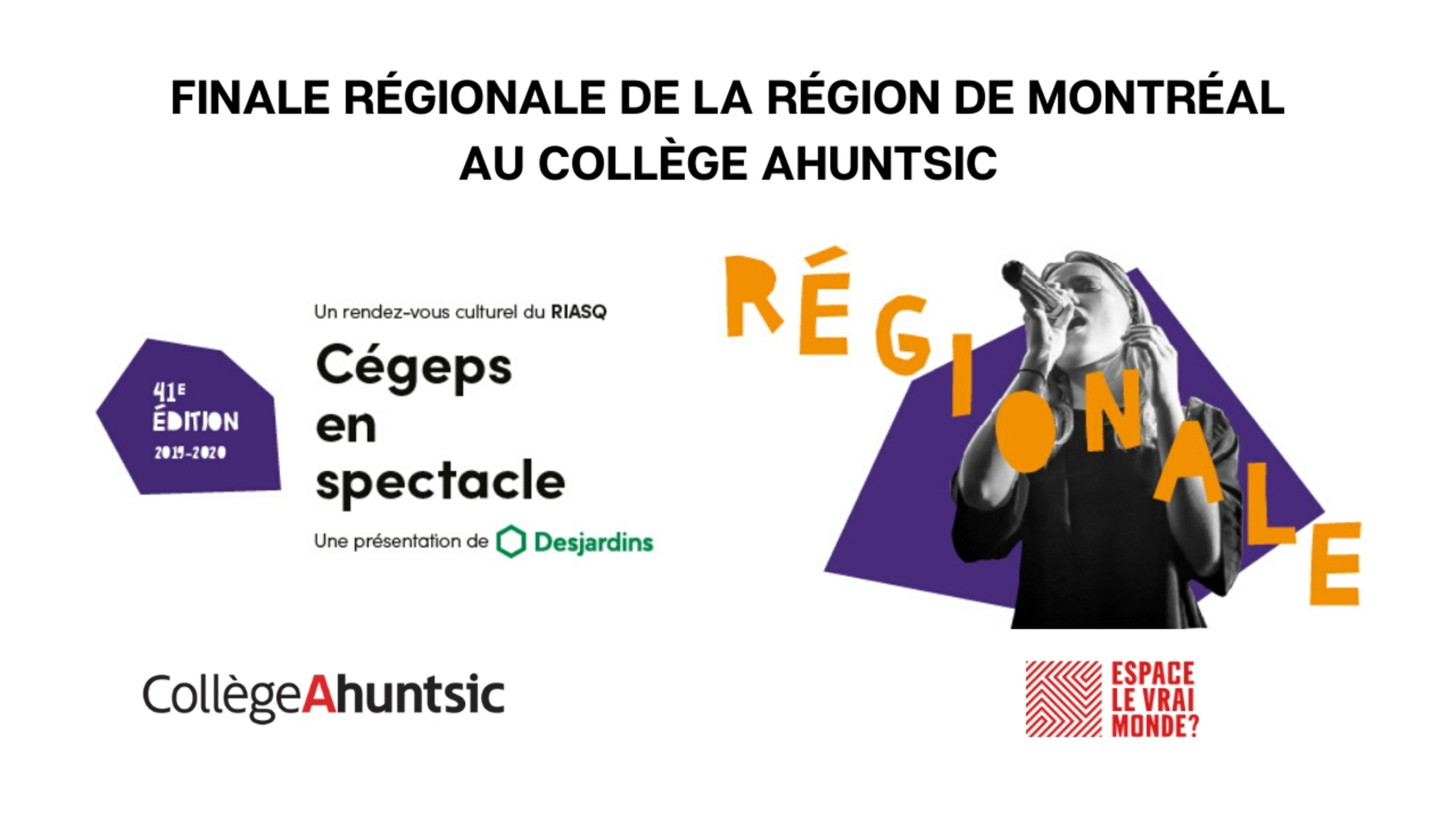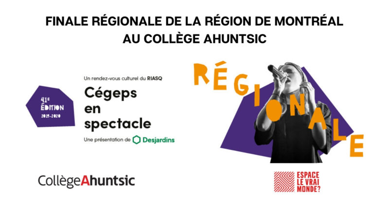 Le Collège Ahuntsic accueillera avec une grande fierté la 41e édition de la finale régionale montréalaise du concours Cégeps en spectacle. Cet événement artistique aura lieu le samedi 21 mars, dès 19 h 30, à la salle de spectacle du Collège Ahuntsic, l’Espace le vrai monde?.