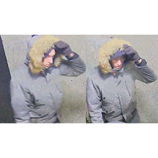 Le premier suspect est vêtu d’un manteau court gris clair avec un capuchon orné de fourrure beige. Il porte des pantalons gris foncé et a des souliers de sport foncés avec trois bandes blanches sur le côté aux pieds.