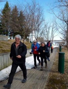 Le lundi 3 avril dernier, dès 9 h 30, 20 membres du Club de marche dynamique ont fait une petite virée à Laval à 6 km/heure, via le Pont Viau : le trajet aller-retour du stationnement de l’Église de la Visitation au bout de la presqu’île est de 7.2 km. Sous un soleil éclatant, l’émerveillement était au rendez-vous : au bout de la presqu’île, deux bernaches nous y attendaient. De retour au stationnement, une partie du groupe marche 1.5 km de plus vers l’Est jusqu’à la rue Boismenu, soit une boucle aller-retour de 3 km (total : environ 10 km). Les personnes qui participent aux marches dynamiques le lundi matin estiment que c’est un bon moyen de commencer la semaine.  Celles qui choisissent plutôt de marcher le mercredi soir à 19 h sont heureuses de refaire le plein après une journée de travail bien remplie.