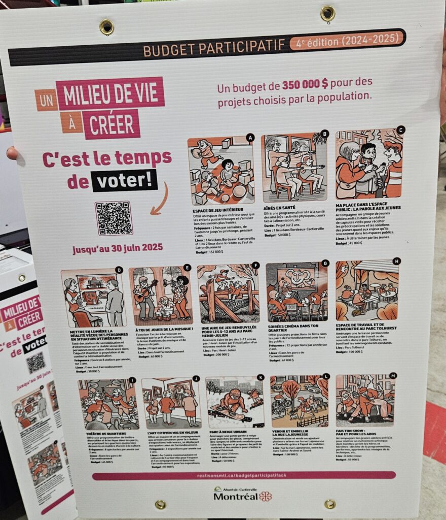 Le choix des projets qui contribueront à l’amélioration des milieux de vie de la population d’Ahuntsic-Cartierville a débuté depuis le mois de mai et se poursuit jusqu’au 30 juin. Pour cette 4e édition du budget participatif, 13 projets sont soumis au vote des habitants.