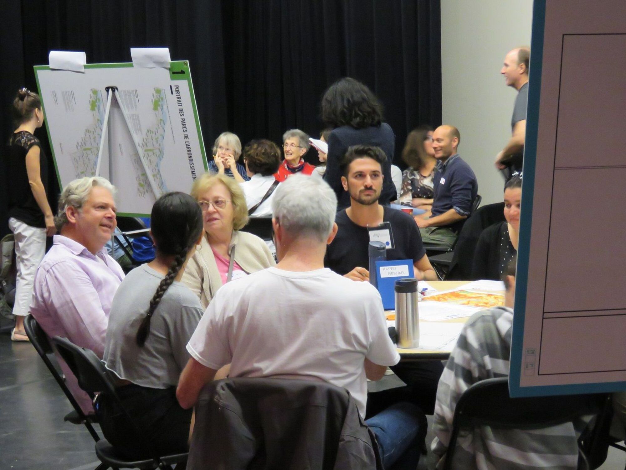 Après en avoir pris connaissance, les participants se sont divisés en ateliers, selon les catégories retenues et qui identifiaient les besoin des quartiers du territoire. Il y avait différentes catégories : les rencontres interculturelles et intergénérationnelles et lieux de rencontre; la sécurité et déplacements actifs, incluant l’accès à l’alimentation ; le verdissement et la protection de l’environnement; l’accès à la culture; et les autres besoins (services, activités, loisirs).