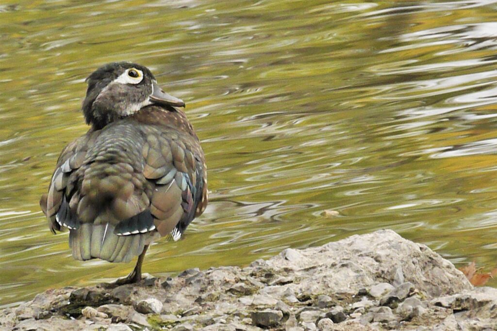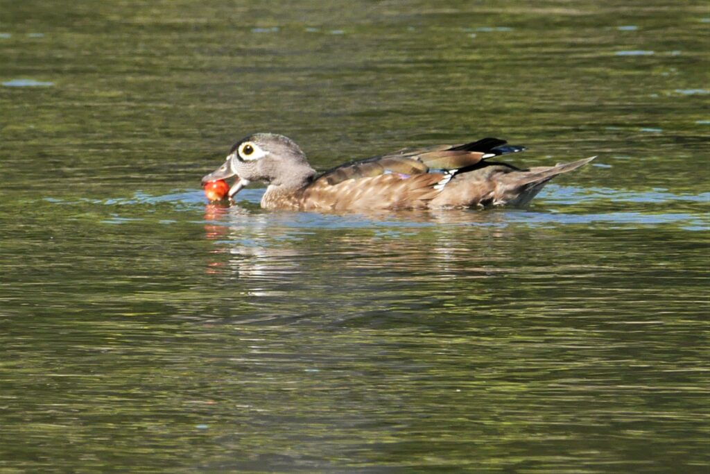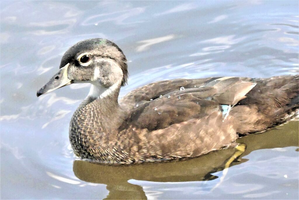 La femelle du Canard branchu n’est certes pas aussi éclatante, mais n’en demeure pas moins intéressante. Sa tête grise possède aussi une huppe, son œil est entouré d’un cercle blanc qui se prolonge en sourcil vers l’arrière un peu comme dans les représentations féminines de l’Égypte des pharaons.