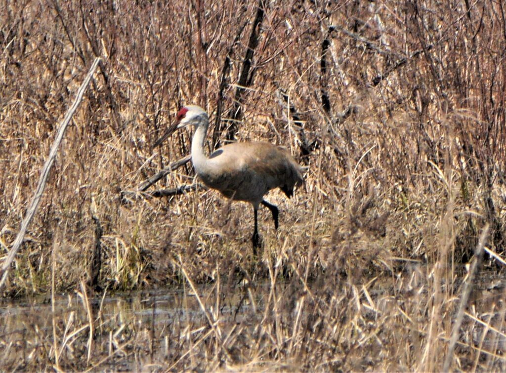 La Grue du Canada (Sandhill Crane ou Grus canadensis) est d’une hauteur similaire à celle du Grand Héron, soit de 1 m à 1 m 20 avec une envergure d’ailes de 1 m 80 à 2 m. Au sol, elle a une apparence plus massive que le héron, et sa masse serait presque le double de celui-ci.