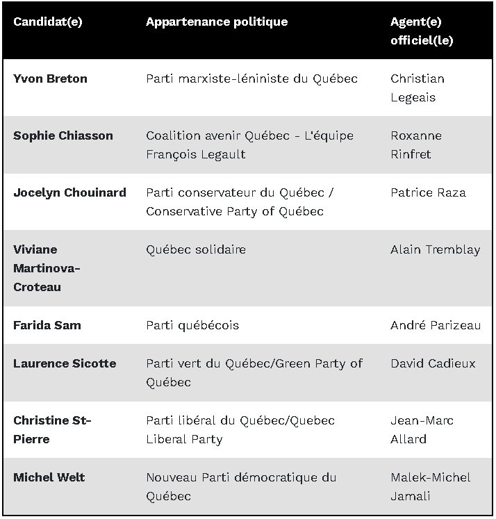 Liste des candidats au 15 septembre (Source DGEQ)