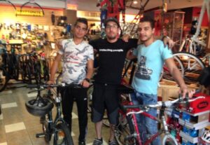 Les deux garçons Kabi et Rony ont reçu un cadeau qui les a rendus heureux. Deux vélos en piteux état ont été donnés à Céline Carrière. Ils ont été remis en ordre comme par magie par l’équipe de Julien Daoust, propriétaire de la boutique Cycles Fleury sur Fleury Ouest. Ça a été fait à un prix d’ami. Sur la photo, Kabi et Rony reçoivent leur vélo. Ils ont tout de suite filé à l’anglaise découvrir avec bonheur et liberté leur nouveau quartier.  (Source: Robert Dumontet, membre du groupe Don d’accueil pour les Syriens)