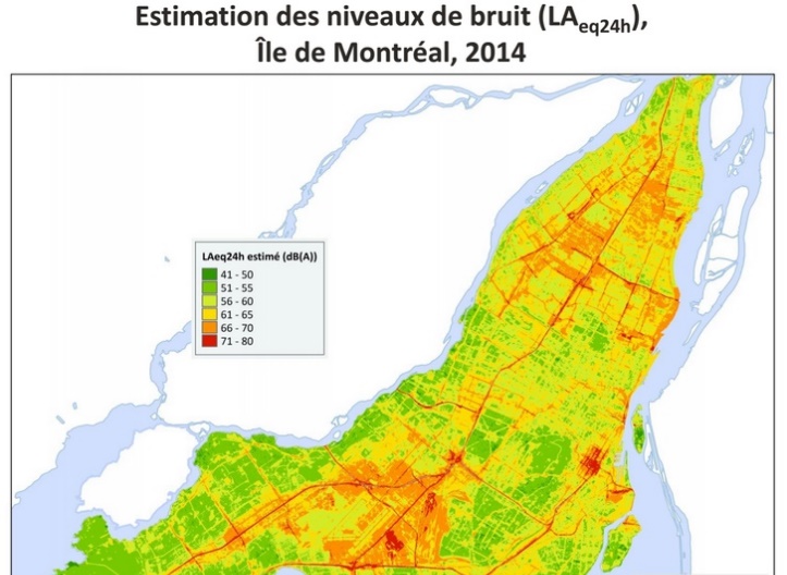 La carte, réalisée par le Centre intégré universitaire de santé et de services sociaux du Centre-Sud-de-l’île-de-Montréal, a été produite à partir de mesures effectuées en 2010 et en 2014 à plus de 200 endroits répartis sur l’île de Montréal. À chacun de ces emplacements, un sonomètre a été installé, afin de mesurer les niveaux de bruit en décibels toutes les deux minutes pendant au moins deux semaines.