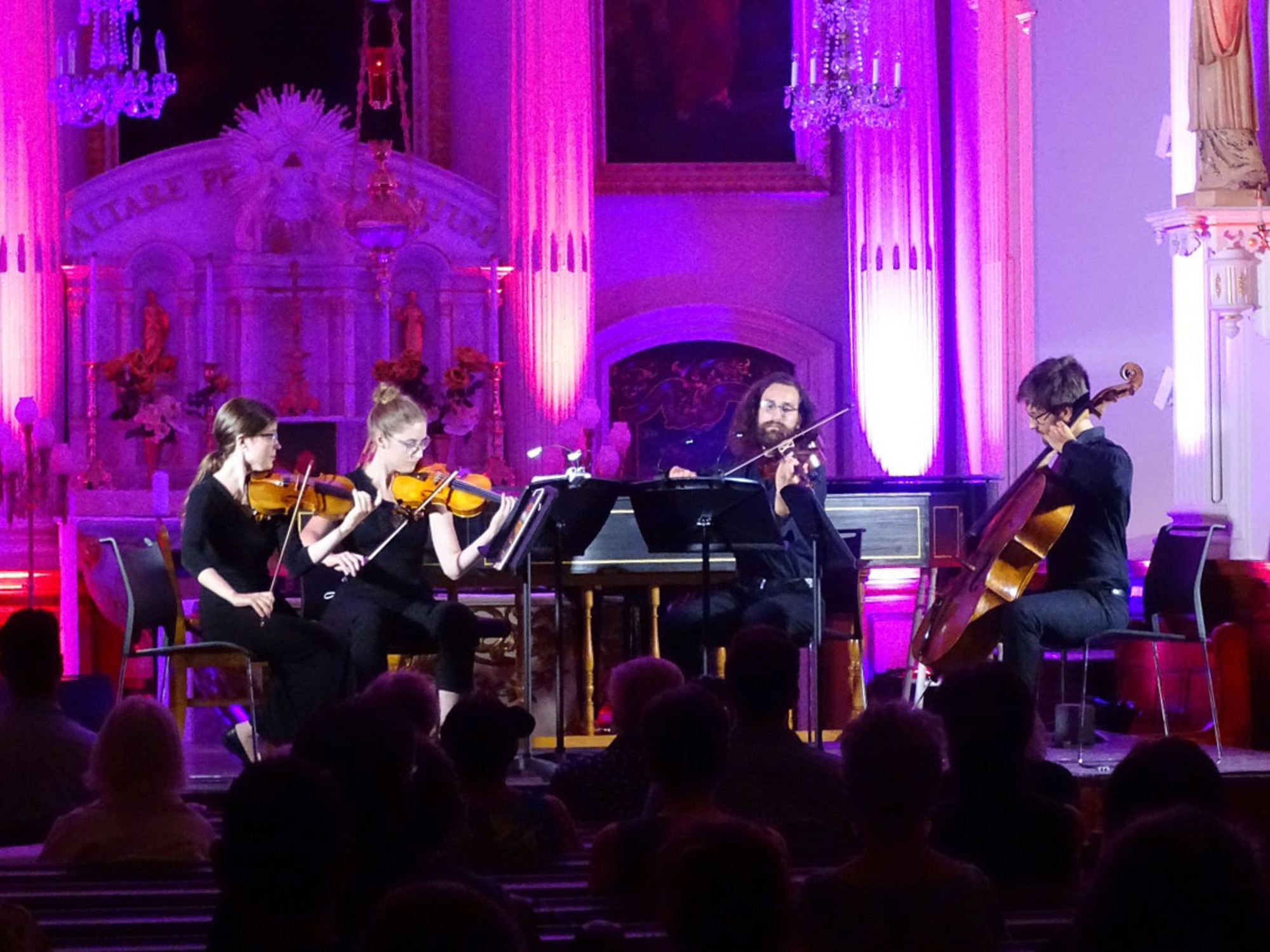 Le jeu de lumières rosacé en fonds de scène du début du concert se mariait bien à la chaleur qui régnait à l’intérieur de la belle église de la Visitation. Est-ce Bach et Beethoven qui nous ont fait oublier cette accablante chaleur ou plutôt la soirée avançant en âge? De même, est-ce Bach et Beethoven qui nous ont fait oublier cette pesante pandémie et nous amener à nous perdre en songes au milieu de cette belle soirée d’été? Ne serait-ce pas plutôt le brio de ces jeunes musiciens du Quatuor Andara et des deux virtuoses du clavier, Luc Beauséjour, claveciniste, et Jimmy Brière, pianiste, qui nous a envoutés?