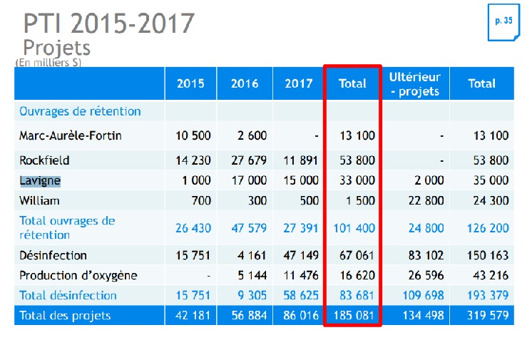 Dans le plan triennal d’immobilisations (PTI) 2015-02017 du Service de l’eau de la Ville de Montréal, présenté en novembre 2014, le coût total des travaux prévus pour la construction du bassin de rétention Lavigne était de l’ordre de 35 M $.