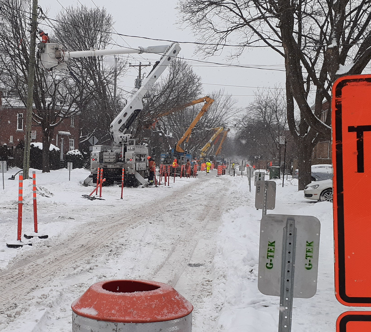 Il semblerait qu’un transformateur devait être installé pour subvenir à la nouvelle charge électrique.  Comble de malchance, le poteau datant des années 1950 qui devait recevoir le nouveau transformateur était trop vieux, il fallait donc le changer avant.  Le sous-traitant d’Hydro-Québec (Valéro) est donc venu dans la semaine du 16 janvier pour faire le travail.  La rue Clark et une bonne partie de la rue Prieur furent envahies de cônes orange pendant au moins cinq jours pour faire le travail, compliqué de plus par une tempête de neige.