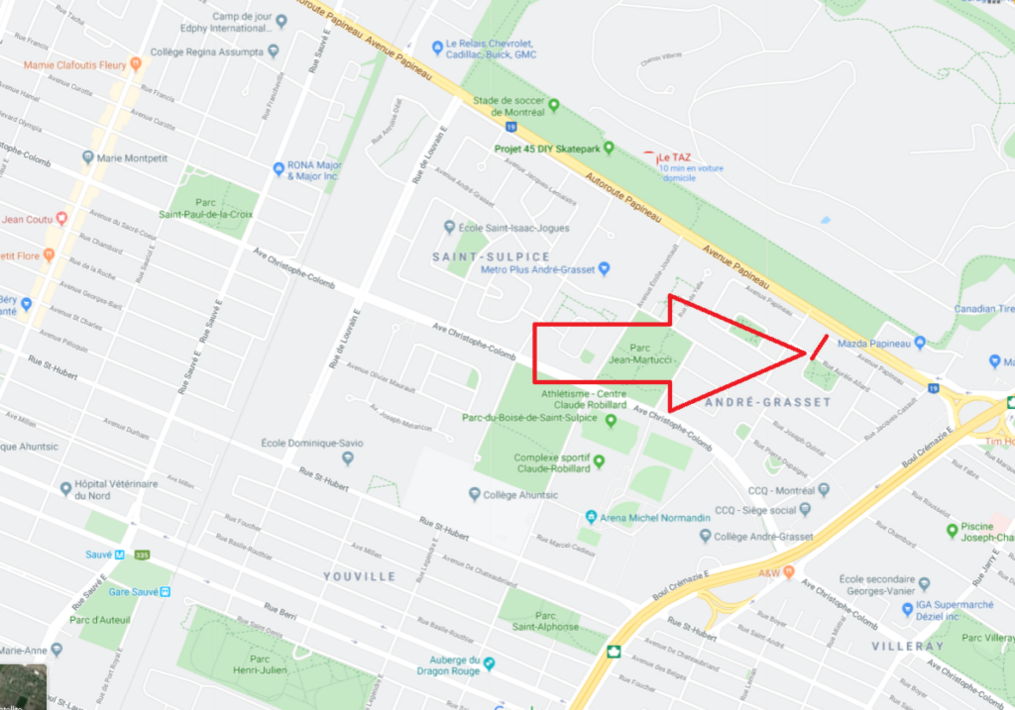 Rue Aldéric-Beaulac (carte : Googlemaps, ajouts : jdv – P. Rachiele)