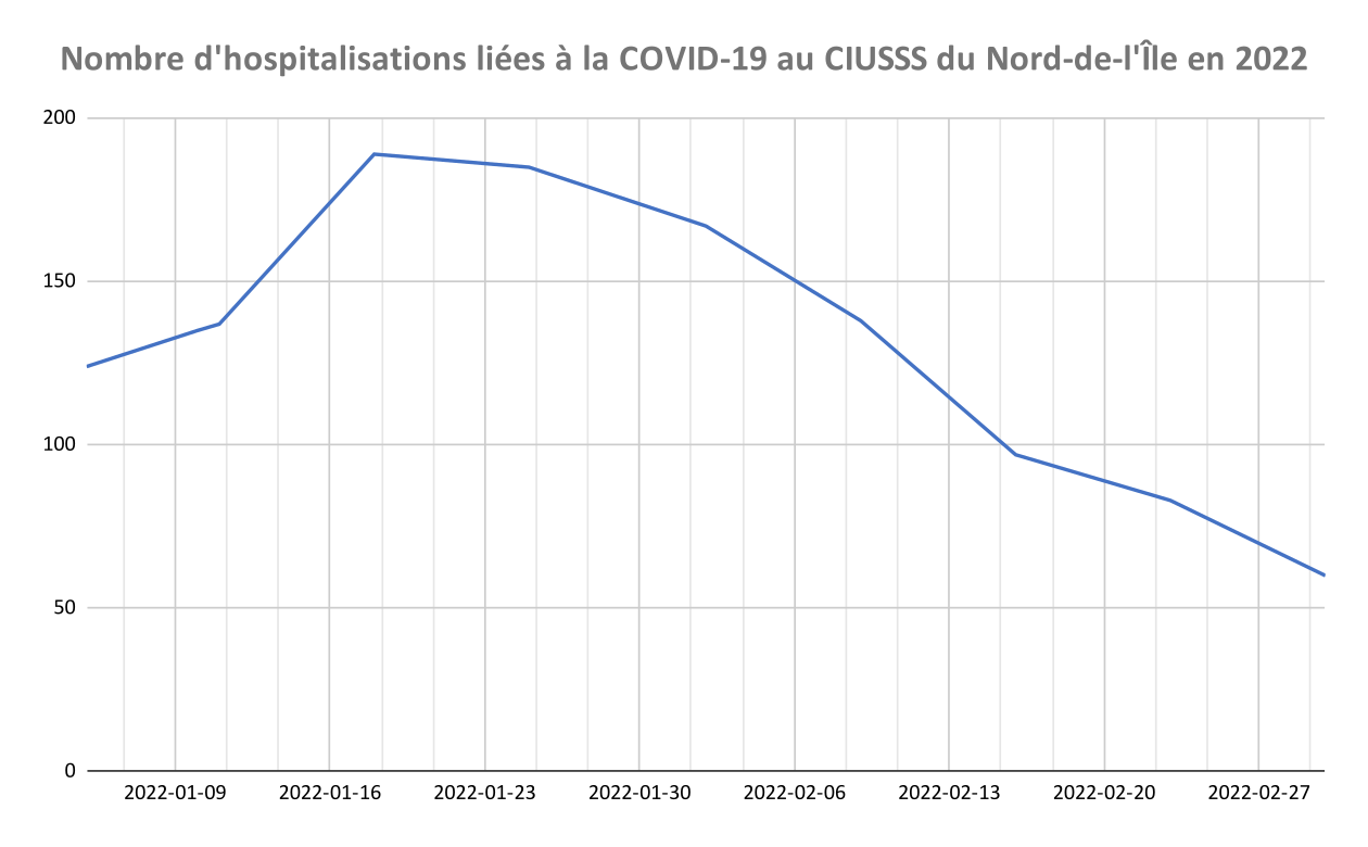 Or, on constate toutefois que la situation dans les hôpitaux ne cesse de s’améliorer depuis janvier, ce qui confirme que, peu importe le nombre de cas réel, les ravages faits par la COVID-19 sont bien moins importants. Depuis la mise à jour COVID du 20 janvier dernier, Journaldesvoisins.com constate une baisse constante du nombre d’hospitalisations en lien avec la COVID-19 dans les hôpitaux du CIUSSS du Nord-de-l’Île-de-Montréal.