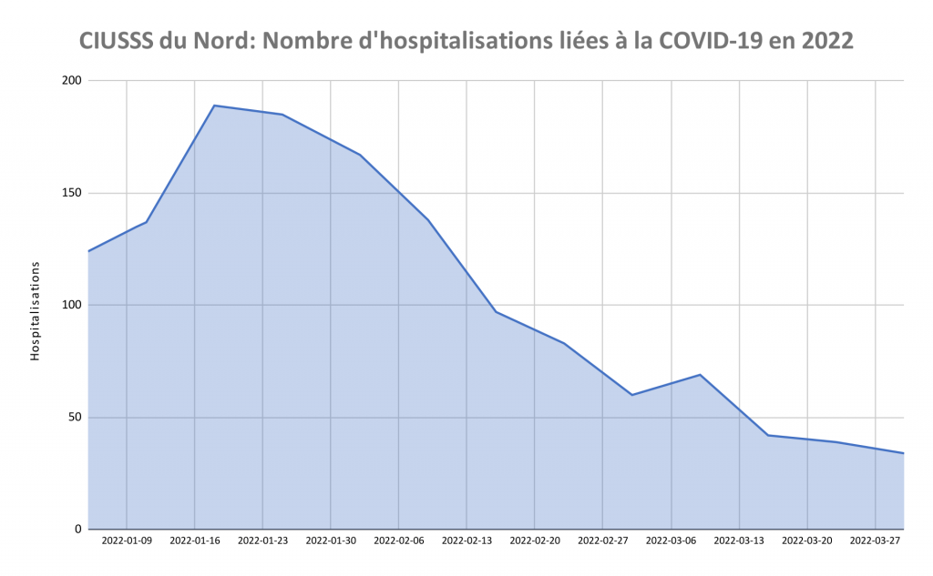 Par contre, les hospitalisations n’ont pas encore augmenté, ce qui est bon signe. Au total, dans les trois hôpitaux du CIUSSS du Nord-de-l’Île-de-Montréal, soit l’Hôpital du Sacré-Cœur, l’Hôpital Fleury et l’Hôpital Jean-Talon, on comptait 34 patients infectés en date de mercredi. Il s’agit du nombre d’hospitalisations le plus bas depuis la mi-décembre 2021. De plus, seulement trois patients nécessitaient des soins intensifs.