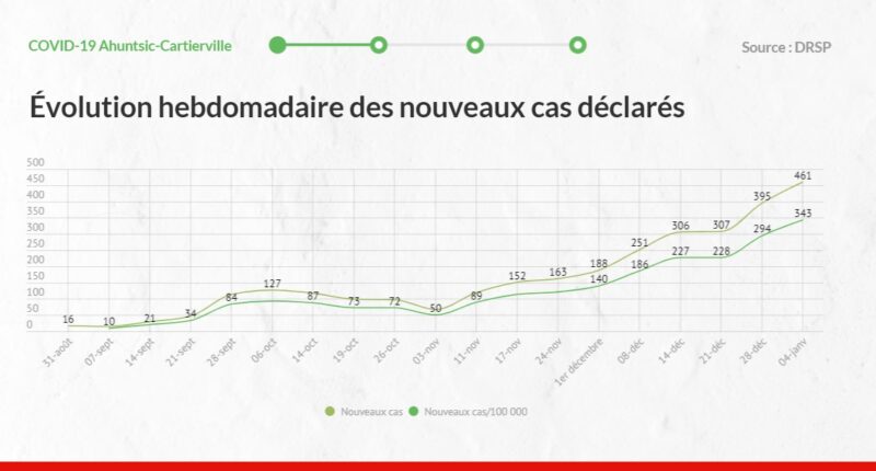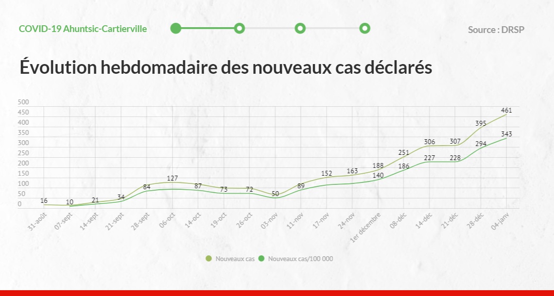 Alors que le gouvernement du Québec s’apprête à instaurer un nouveau confinement, Journaldesvoisins.com s’est penché sur quelques données épidémiologiques qui permettent de visualiser la progression fulgurante de la deuxième vague de la pandémie de COVID-19 dans l’arrondissement, malgré la hausse du niveau d’alerte et le renforcement des mesures de Santé publique, l’automne dernier.