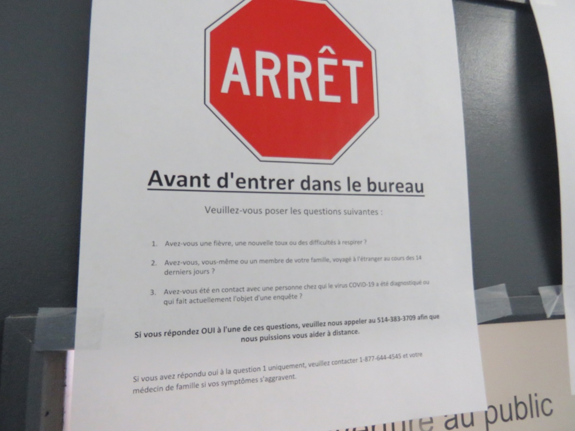 Pancarte sur la porte du bureau de Mélanie Joly concernant les précautions à prendre avant d’entrer pour éviter la propagation du Coronavirus (Photo : Philippe Rachiele, JDV)
